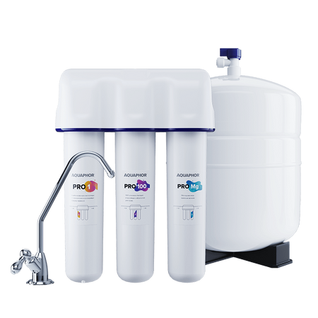 System odwróconej osmozy z kompaktowym zbiornikiem i innowacyjnymi wkładami serii Pro. Wkład wstępny Pro 1 2w1 do usuwania zanieczyszczeń mechanicznych o zwiększonej skuteczności filtracji zastępuje dwa wkłady wstępne stosowane w poprzedniej generacji serii filtrów AQUAPHOR Osmo Pro 100 zawiera membranę RO, która bardzo dokładnie usuwa z wody nawet najbardziej niebezpieczne zanieczyszczenia, w tym wszelkie substancje toksyczne, bakterie i wirusy. PRO M odpowiada za końcowe uzdatnianie i remineralizację wody.