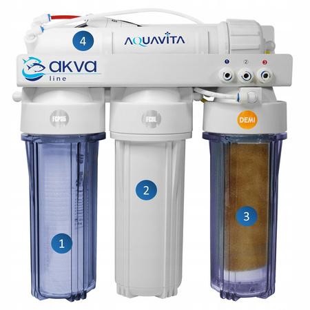 Oryginalny filtr akwarystyczny Aqua Vita z membraną osmotyczną, wkładami Aquafilter, wkładem rozbieralnym z żywicą MB400 oraz kompletem przyłączy, dedykowany do produkcji wody całkowicie zdemineralizowanej.